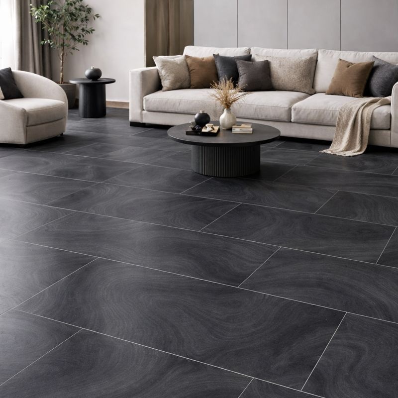 La teinte gris foncé offre un rendu visuel neutre et contemporain qui s'harmonise avec de nombreux styles d'intérieur. La surface mate réduit les reflets et crée une atmosphère calme et équilibrée. Cette combinaison convient parfaitement aux projets de revêtements de sol résidentiels et commerciaux.