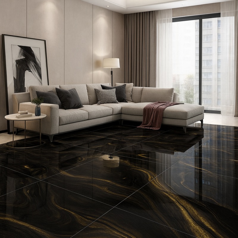 La surface polie révèle des nuances de noir profond et riche, offrant une apparence luxueuse et raffinée. Cette finition élégante favorise la réflexion de la lumière, rendant les espaces plus lumineux et plus spacieux. Elle crée un style haut de gamme qui s'accorde aussi bien avec les intérieurs modernes que classiques.