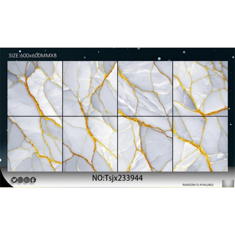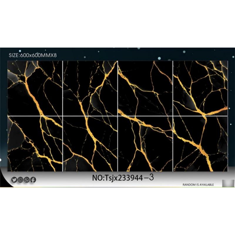 Le motif de surface présente d'élégantes veinures dorées et une structure inspirée du marbre. La texture visuelle est raffinée et harmonieuse sur chaque pièce. Ce design confère au sol une allure haut de gamme et coordonnée.