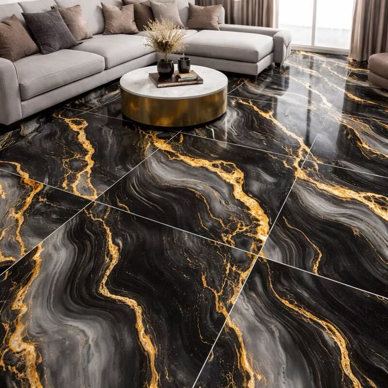 Ce carreau de céramique présente une surface brillante, une texture de pierre raffinée et d'élégants veinures dorées, créant un effet visuel épuré et moderne. Sa finition polie accentue la réflexion de la lumière tout en conservant un aspect naturel inspiré du marbre, convenant ainsi à divers espaces intérieurs. Fabriqué selon des normes rigoureuses, il offre une qualité constante pour les applications murales et de sol, tant résidentielles que commerciales.