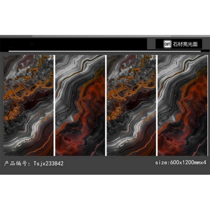 La surface émaillée et polie présente des veinures lisses et continues qui créent un effet décoratif haut de gamme. Les lignes fluides ajoutent de la profondeur et un rythme visuel sans être trop imposantes. Ce carrelage convient ainsi parfaitement aux aménagements de sols intérieurs élégants.