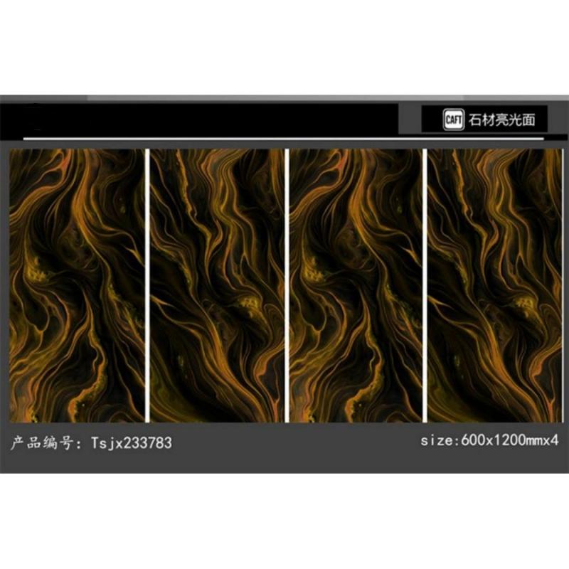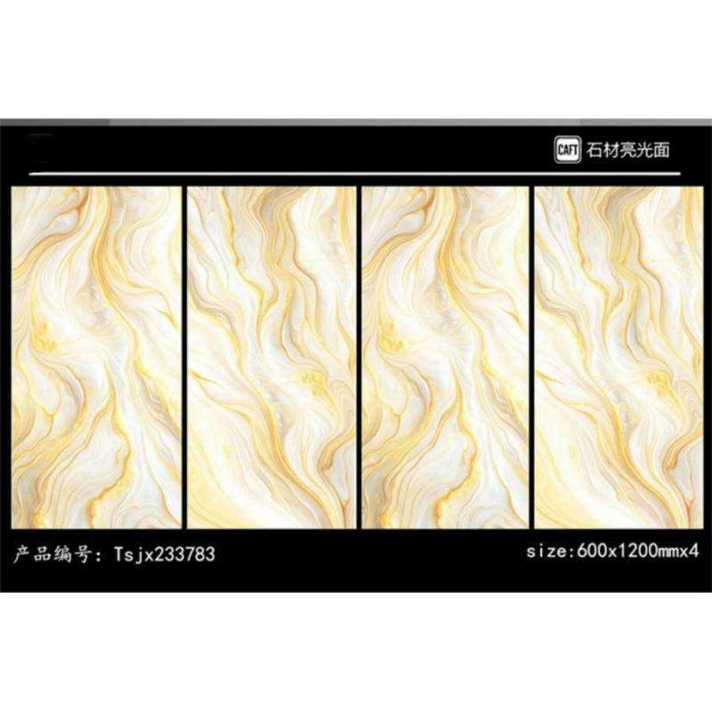 La surface brillante, rehaussée de veinures dorées, offre une allure raffinée et luxueuse. Elle accentue la luminosité de l'espace et donne de la profondeur aux sols intérieurs. Cet effet visuel sublime les concepts de décoration intérieure haut de gamme.