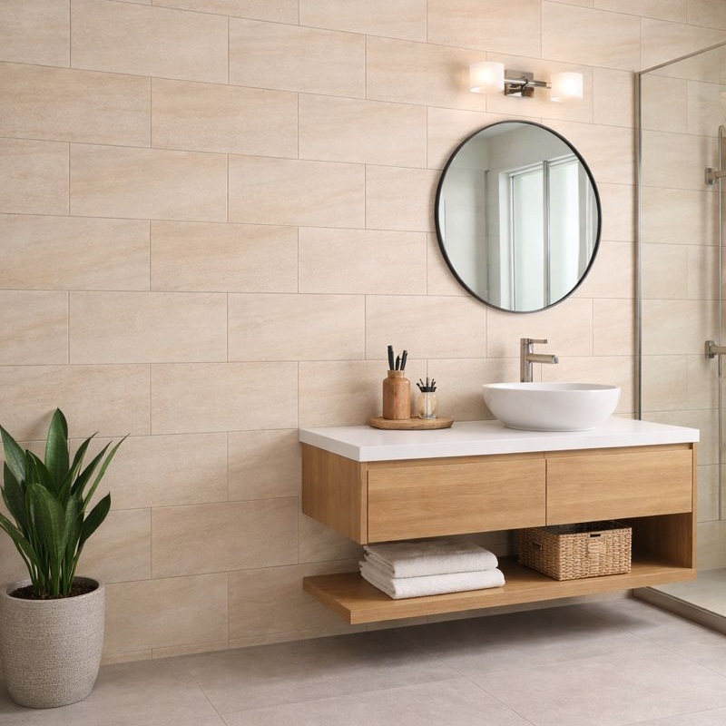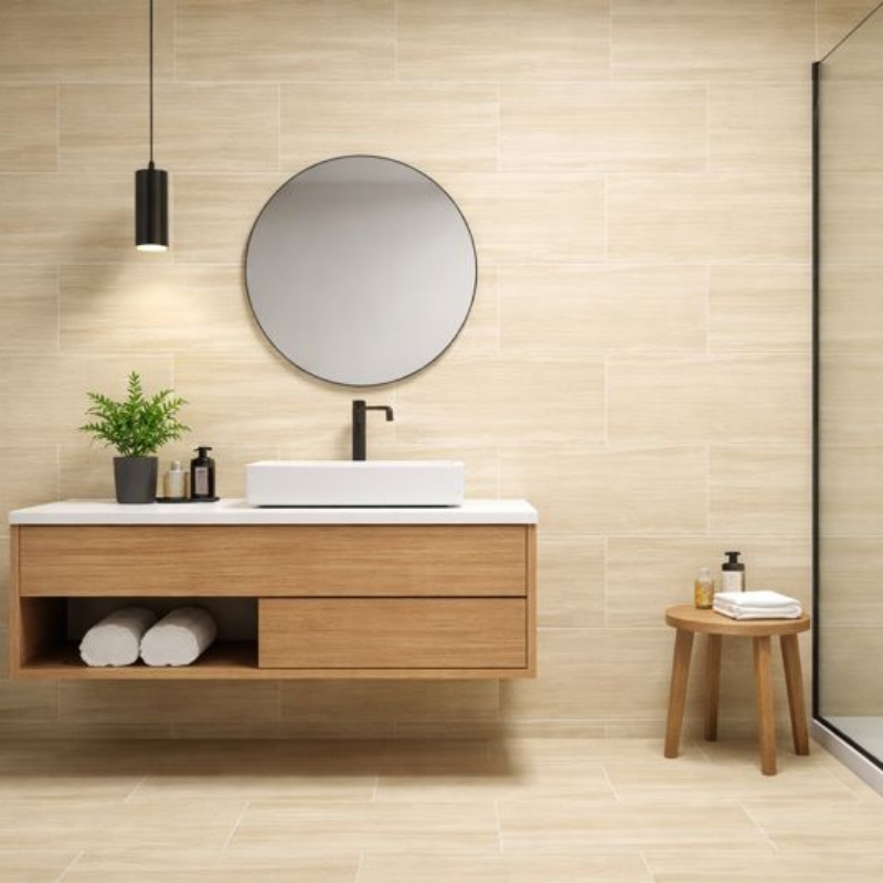 Ce carrelage en céramique présente une surface mate aux tons clairs, créant un effet visuel épuré et apaisant pour les murs intérieurs. Spécialement conçu pour les salles de bains et les pièces humides, il contribue à réduire les reflets, à améliorer la stabilité de la surface et à préserver son aspect neuf. Il est largement utilisé dans les salles de bains, les sanitaires, les hôtels, les appartements et les projets de rénovation résidentielle.